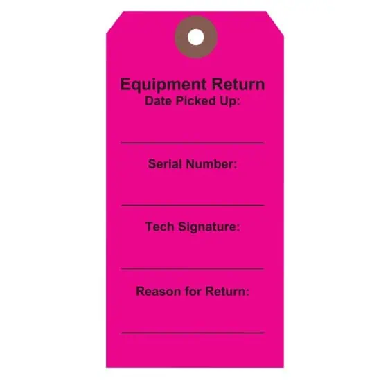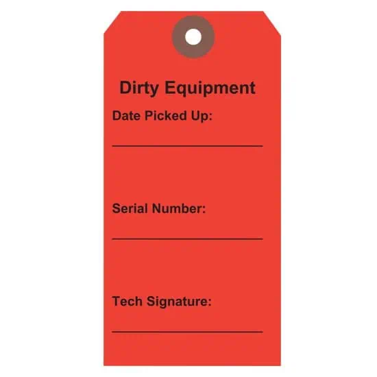 - Brightly colored tags inform staff of equipment status. Tags come with plastic cable ties. Also available in new plain style. Each style sold in packs of 250. Red for Dirty, Green for Clean, Yellow for Equipment Repair and Hot Pink for Equipment Return.