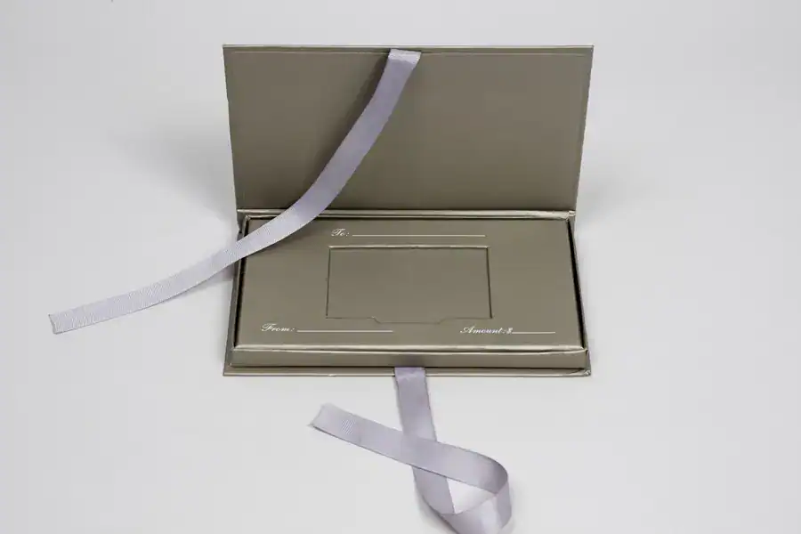 7 1/4 x 4 1/4 x 5/8, Platform Gift Card Boxes, Matte Bronze, Bronze Ribbon, Bronze Insert