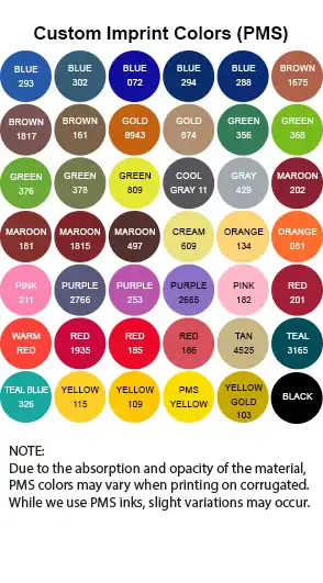 *Imprint minimums cannot be combined across sizes. - Ink color options: Wide range of PMS ink colors available.